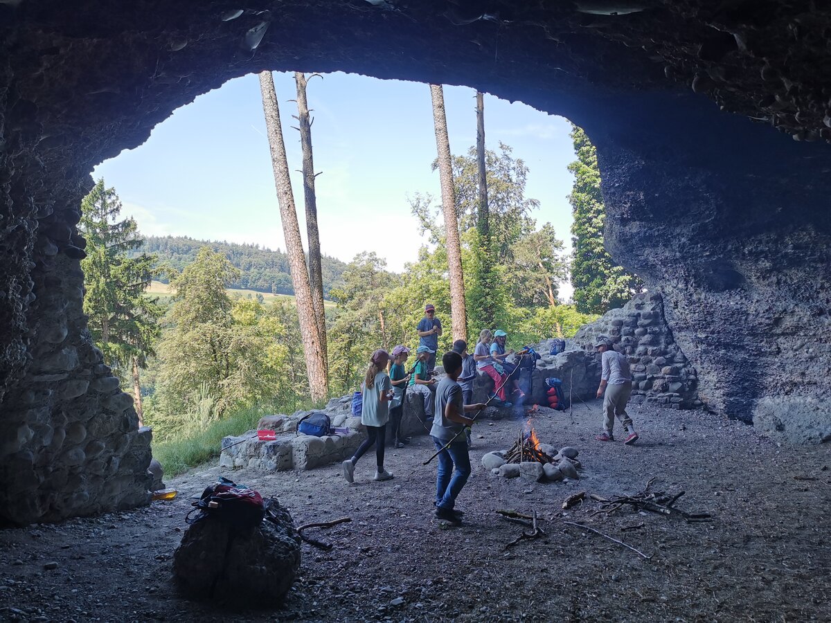 Nach der Führung wanderten wir weiter zum Erdmänndliloch. In dieser grossen und schönen Höhle haben wir ein Feuer gemacht und gebrätelt. Nachdem wir viel geklettert sind und Spiele gespielt haben, sind wir zum Hueb-Hof nach Bachs gewandert.