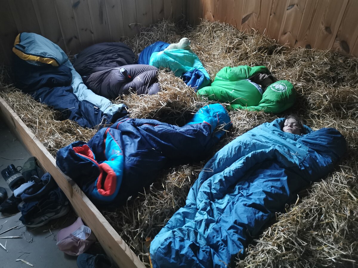 Wir haben im Stroh geschlafen. Um 00:00 Uhr war es still im Stroh. Die meisten haben gut geschlafen. Am Morgen war es sehr kalt. Fast alle waren um 5 Uhr wach. Zum Frühstück gab es Schokoladenmilch, Erdbeeren, Brot mit Marmelade und Butter und Cornflakes. Wir haben viele Spiele gespielt. Das Restaurant Hueb hat immer Mo-Di offen. Wir haben dann noch ein Interview mit der Besitzerin Regula Erb gemacht.