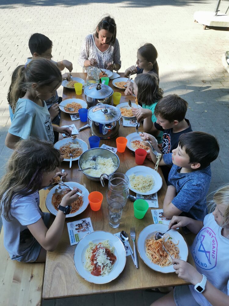 Auf dem Bauernhof leben 2 Ziegen, Munis, Schottische Hochlandrinder, eine Katze und Hühner. Zum Abendessen gab es Pasta mit Tomatensauce.