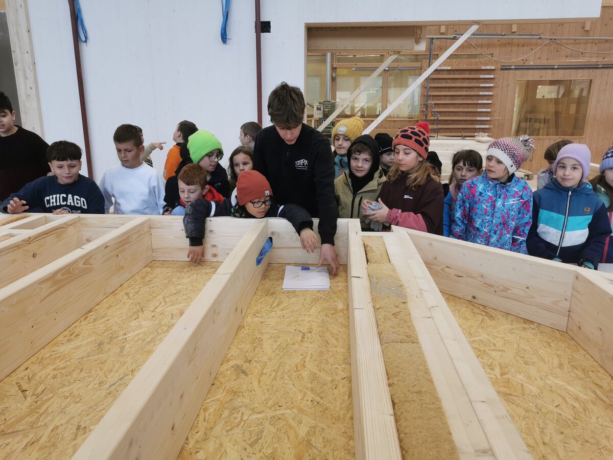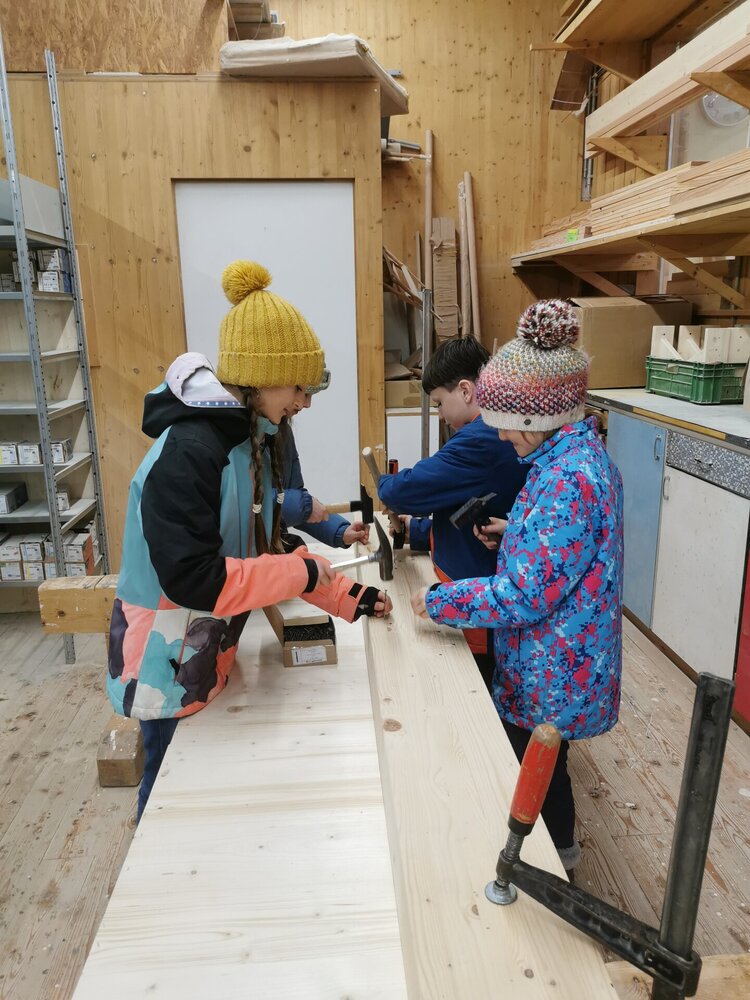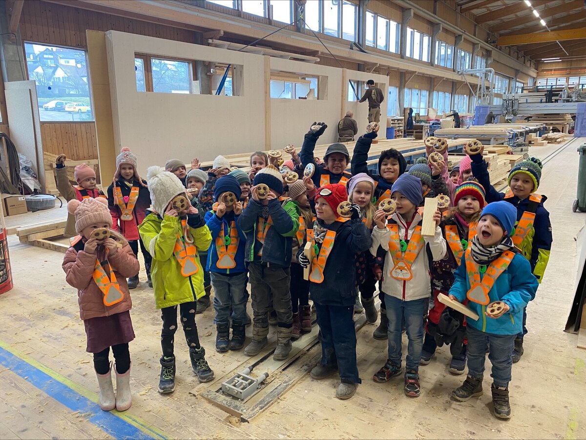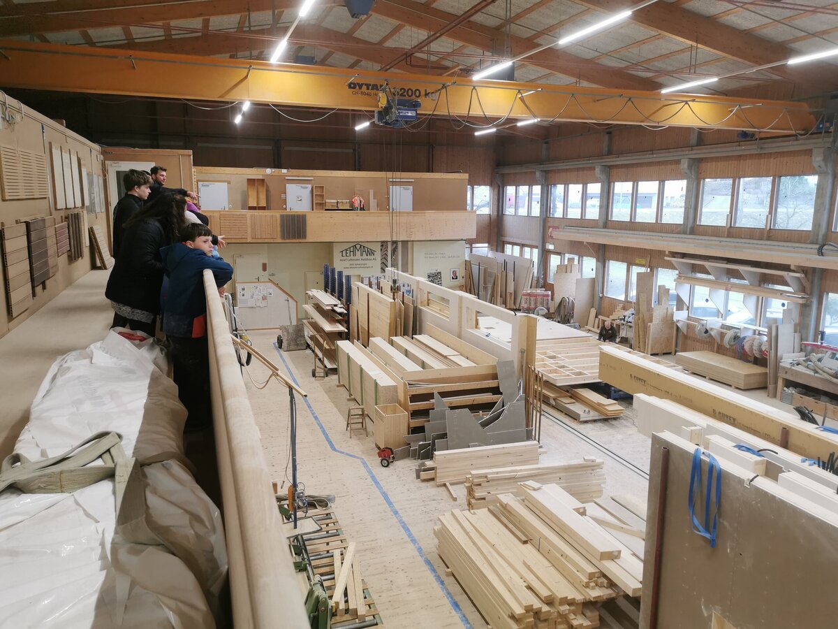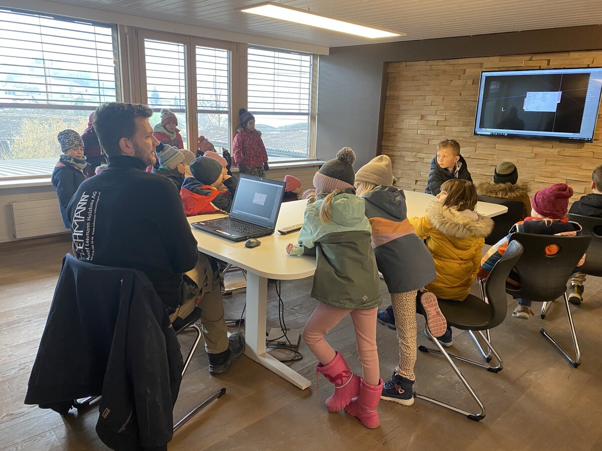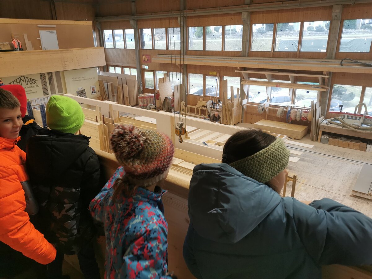Mitte Februar durften alle Kinder und Lehrpersonen von der Primarschule Schneisingen die Firma Lehmann besuchen und schauen, wie der Kindergarten gebaut wird. Als erstes hat man uns ein 3D Modell auf dem Computer gezeigt. Man hat uns erklärt wie der Kindergarten aufgebaut wird, wo welche Räume sein werden und vieles mehr. In der grossen Werkstatt haben wir das Dach gesehen und wie es gebaut wird. Es gab riesige Maschinen um kleine Holzstücke zu sägen. An verschiedenen Posten konnten wir sägen, bohren, Nägel in ein Holz einschlagen und noch etwas ganz Spezielles! machen Wir durften unsere Hand auf ein Blatt legen nachfahren und in den Handabdruck schrieben wir unseren Namen und Geburtsdatum hinein. Die Blätter mit den Händen durften wir dann in eine Innenwand des Kindergartens legen. Dass wenn einmal der Kindergarten abgerissen oder umgebaut wird, die Leute dann unsere Zeichnungen finden. Am Ende bekamen wir alle einen Turnsack und einen Spitzbub. Das war echt toll! Wir haben viel gelernt an diesen Tagen und danken der Firma Lehmann, dass wir sie besuchen durften.