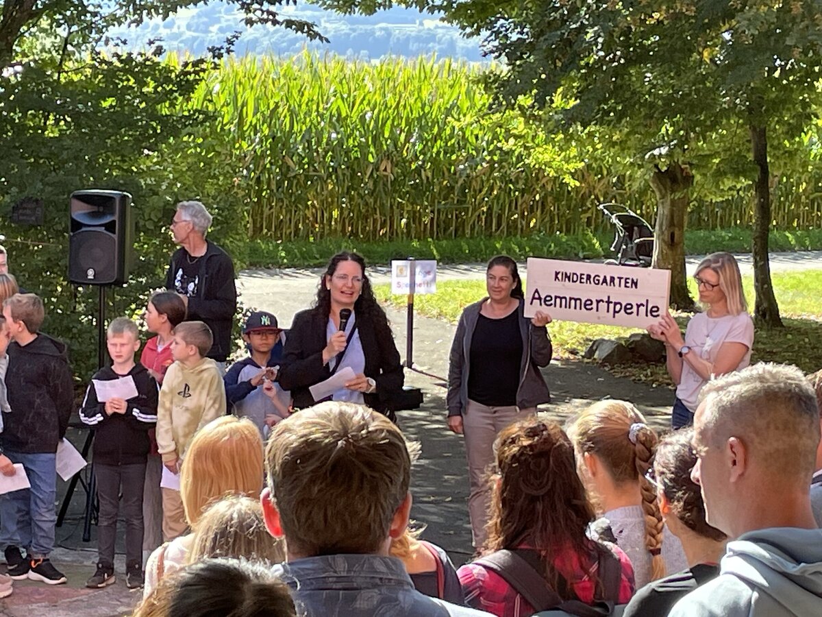 Auch der Wettbewerb für den Namen des neuen Kindergartens wurde aufgelöst und der Name feierlich bekannt gegeben: „Kindergarten Aemmertperle“, ein Vorschlag von Mateo aus der 5. Klasse.