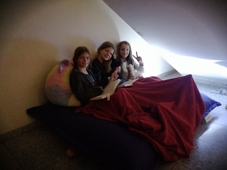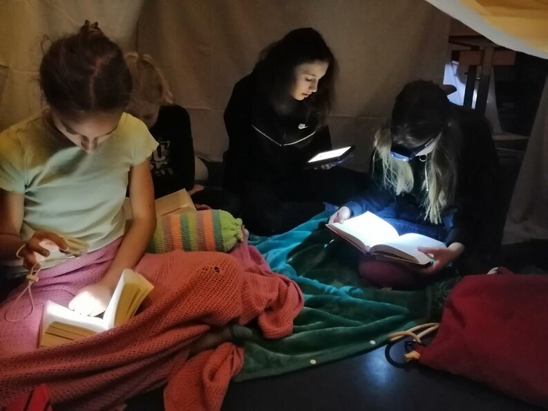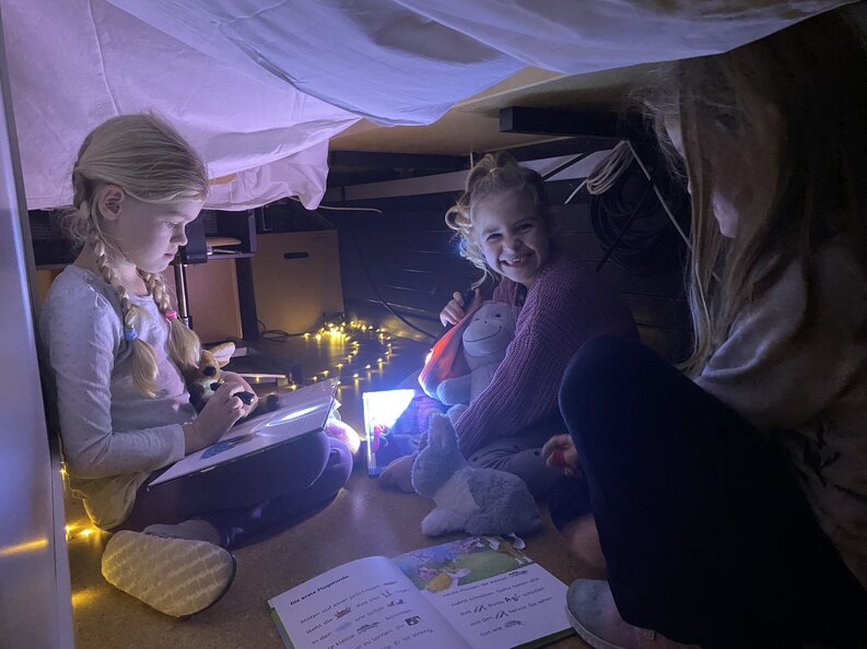 Pünktlich um 18 Uhr strömten alle Kinder der Primarschule Schneisingen ins Schulhaus. Mit Kissen, Buch und Taschenlampe ausgerüstet konnten es viele Kinder fast nicht erwarten, abends ins Schulhaus zu stürmen. Die diesjährige Lesenacht stand, wie auch die Schweizerische Lesenacht, unter dem Motto «Traumwelten». In den stimmungsvoll eingerichteten Schulzimmern träumten sich die Schülerinnen und Schüler in die Helden der Bücherwelt hinein. Nicht nur den kleineren Kindern wurden Bücher vorgelesen, auch die älteren Schülerinnen und Schüler genossen es, vorgelesen zu bekommen. So träumten sie sich unter anderem mit Franz Hohlers «Tschipo» in die Steinzeit und mit Alex Rühles «Traumspringer» in die Träume von anderen Menschen. Gemeinsam mit der Herzensfreundin oder dem besten Freund das Lieblingsbilderbuch anschauen und das mit einer Taschenlampe in einer selbstgebauten Hütte… Wer träumte als Kind nicht auch davon? Ein gelungener Abend war es auf jeden Fall für alle Beteiligten und lädt zum Nachahmen zu Hause ein. Was gibt es Schöneres, als mit einem Buch in eine Traumwelt abzutauchen - wann haben Sie das das letzte Mal gemacht? Vielleicht ist heute der richtige Abend dafür.