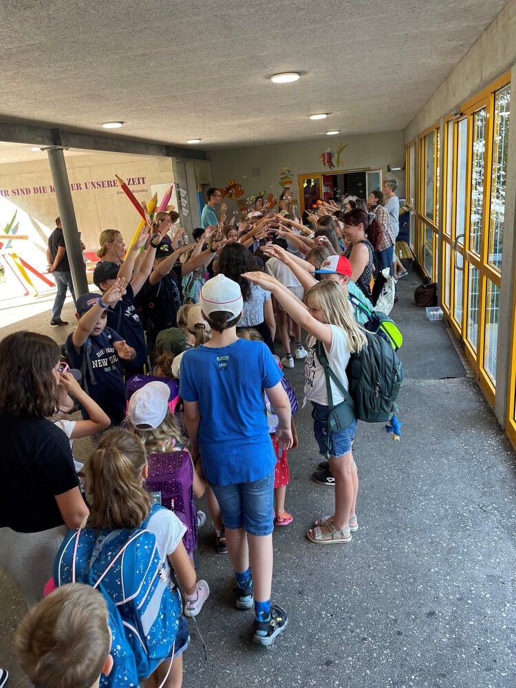 Am Montag, 12. August 2024 starteten 16 neue Kindergartenkinder und 17 Kinder freuten sich über ihren ersten Schultag im Schulhaus. Mit dem Lied «Heute kommst du in die Schule» wurden die neuen Erstklässlerinnen und Erstklässler von den Grossen, den Lehrpersonen und der Schulleitung auf dem Pausenplatz begrüsst. In der Schule Schneisingen werden in diesem Schuljahr 113 Kinder von rund 18 Lehrpersonen unterrichtet. Unterstützt werden sie dabei von drei sehr hilfsbereiten Klassenassistentinnen und drei freiwilligen Senioren. Wir freuen uns alle auf ein spannendes und erlebnisreiches Schuljahr unter dem Motto «Kopf, Herz, Hand, mir beweged allerhand».