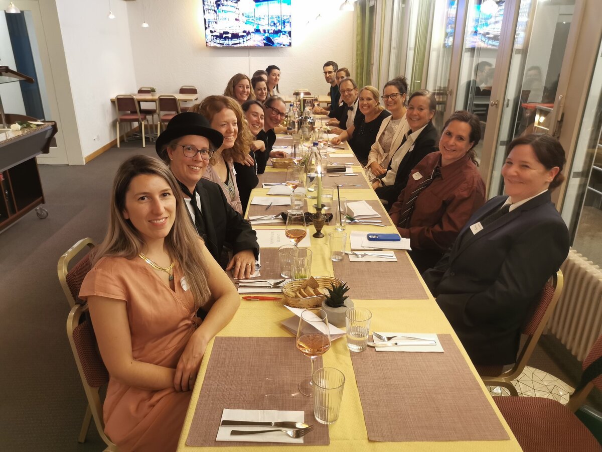 Die kurze Zeit bis zum Abendessen nutzten einige für einen Spaziergang durchs weihnachtlich geschmückte Dorf, andere bereiteten sich auf ein spezielles Abendessen vor… Um 18 Uhr trafen sich alle zum mit Spannung erwarteten Krimidinner „Hollywoods Lügen“. Jeder Person wurde im Vorfeld eine Rolle zugeteilt und sie kam entsprechend gekleidet zum ‘Galadinner’. Während des Abends musste ein Mord aufgedeckt werden! Die Aufklärungsarbeiten waren garniert mit Hollywood-Auszeichnungen, neuen Filmproduktionen, Intrigen, abgelehnten Heiratsanträgen und – am wichtigsten – viel Gelächter.