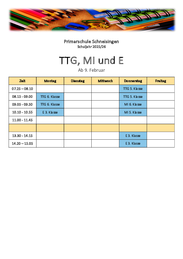 Die 9 Lektionen finden am Montag von 8.15 bis 10.55 Uhr und am Donnerstag von 7.25 bis 10.55 Uhr und 13.30 bis 15.05 Uhr statt. Den genauen Stundenplan finden Sie unten.