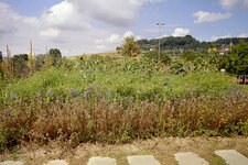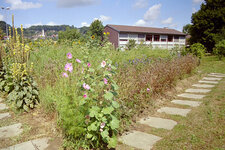 Der Abfluss des Dachregenwassers fliesst durch ein freiliegendes, offenes Naturbachbett und bildet so eine eigene, reizvolle Vegetationsvielfalt.