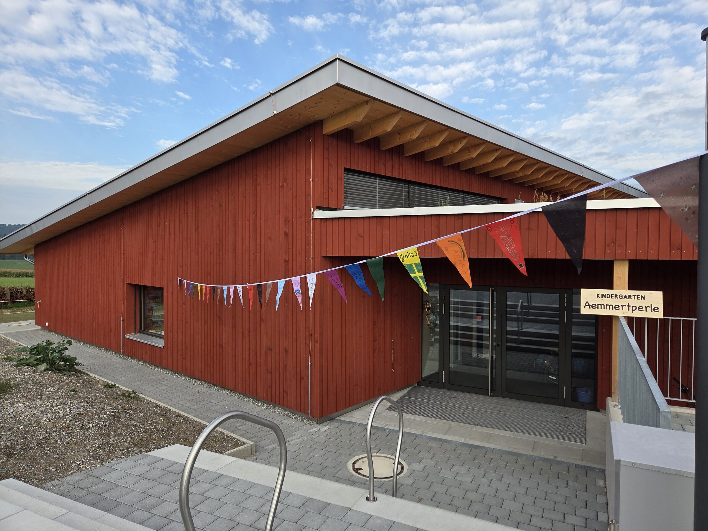 Auf das Schuljahr 2025/26 wurde der neue Kindergarten bezogen. Er befindet sich auf dem Schulgelände und trotzdem mitten in der Natur. Er bietet Platz für zwei Abteilungen, verfügt über einen Gruppenraum mit Küche sowie einen Material- und Technikraum. Es handelt sich um einen Holzelementebau, dessen Fassade aus schneisinger Holz besteht. Auf dem Dach befindet sich eine 300m2 grosse Solaranlage mit einer Leistung von 58 KWp. Durch die grosszügige Fensterfront im Süden wird der Blick frei auf den Pausenplatz mit Kletterturm.